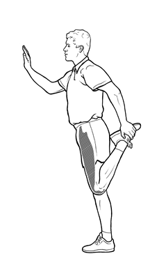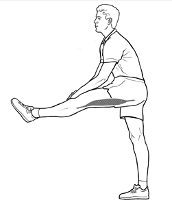 Ook het rekken van de voorkant van je bovenbenen is nuttig, maar wees wel voorzichtig. Rek deze spieren niet in de beginfase van de blessure en niet als de pijn daardoor erger wordt.
