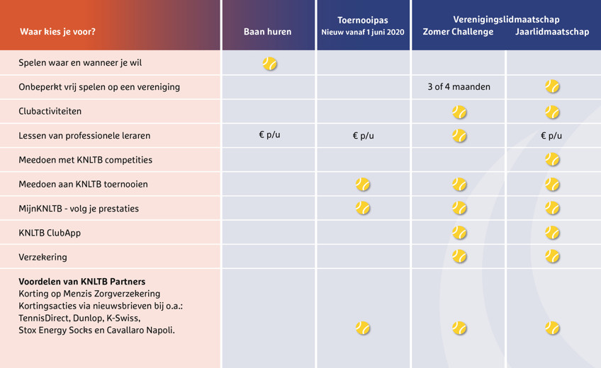 Meer dan 1 miljoen mensen tennissen in Nederland. En dat kan op verschillende manieren. Je kan natuurlijk af en toe een losse baan huren. Dan mis je de voordelen van een KNLTB lidmaatschap. Verreweg de meeste tennissers kiezen voor een verenigingslidmaatschap bij een van onze ruim 1.650 verenigingen. En wil je dit eerst een periode uitproberen? Kies dan voor de Zomer Challenge, een compact lidmaatschap van 3 a 4 maanden. Wil je liever flexibel af en toe een baan huren maar wel toernooien spelen? Kies dan voor de Toernooipas.