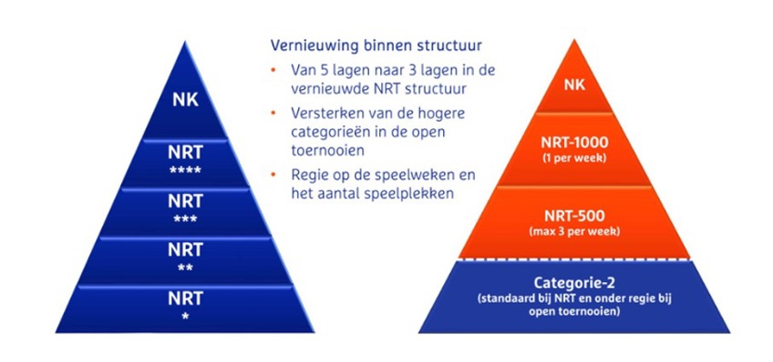 - Punten behaald in de oude NRT structuur worden tot april 2025 meegenomen in de berekening van de best of ranking. Omdat de best of berekend wordt op basis van de best resultaten van de afgelopen 52 weken worden toernooien volgens de oude structuur dus steeds verder uitgefaseerd.