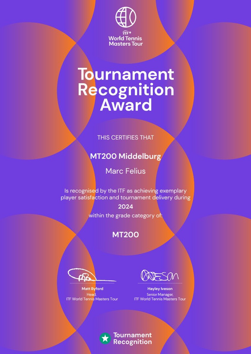 Voor de vijfde keer wordt het ITF WT Masters Tour MT 200 in Middelburg georganiseerd. Op de gravel banen van MLTC verwelkomt toernooidirecteur Marc Felius van 7 t/m 13 juli 2025 graag deelnemers van over de hele wereld in de leeftijdscategorieën 30+, 35+, 40+, 45+, 50+, 55+, 60+, 65+, 70+, 75+, 80+, 85+ en 90+.
