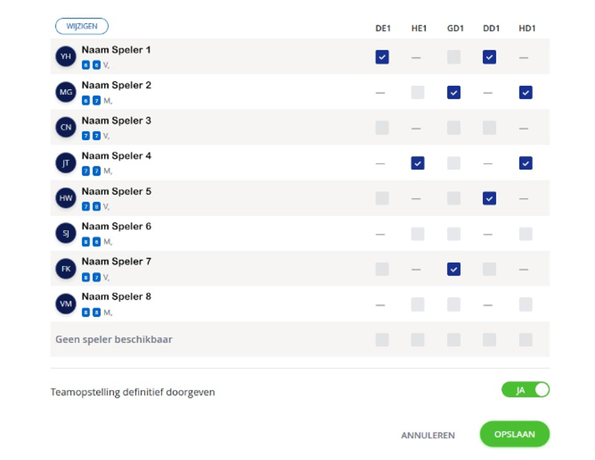 In bovenstaande afbeelding zie je hoe de digitale teamopstelling er uit komt te zien. De speelsterktes van alle spelers worden getoond en automatisch gerangschikt op basis van speelsterkte (eerst enkel, dan dubbel). Vanzelfsprekend kunnen dames niet worden opgesteld in herenpartijen en vice versa. De optie 'Geen speler beschikbaar' is bedoeld voor walk-overs of wanneer teams niet voltallig komen opdagen.