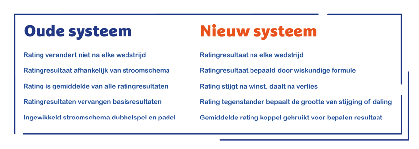 In het nieuwe systeem is het eenvoudig: elke wedstrijd die je speelt, heeft effect op je rating. Bij winst stijgt je rating, bij verlies daalt je rating. Hierbij geldt een boven- en ondergrens, waardoor je niet ineens heel hard kan stijgen of dalen. In onderstaande afbeelding staan de verschillen van het oude systeem ten opzichte van het nieuwe systeem uitgelegd.