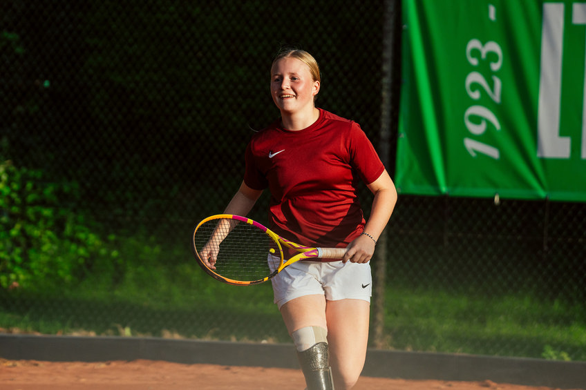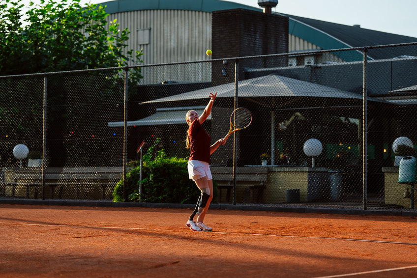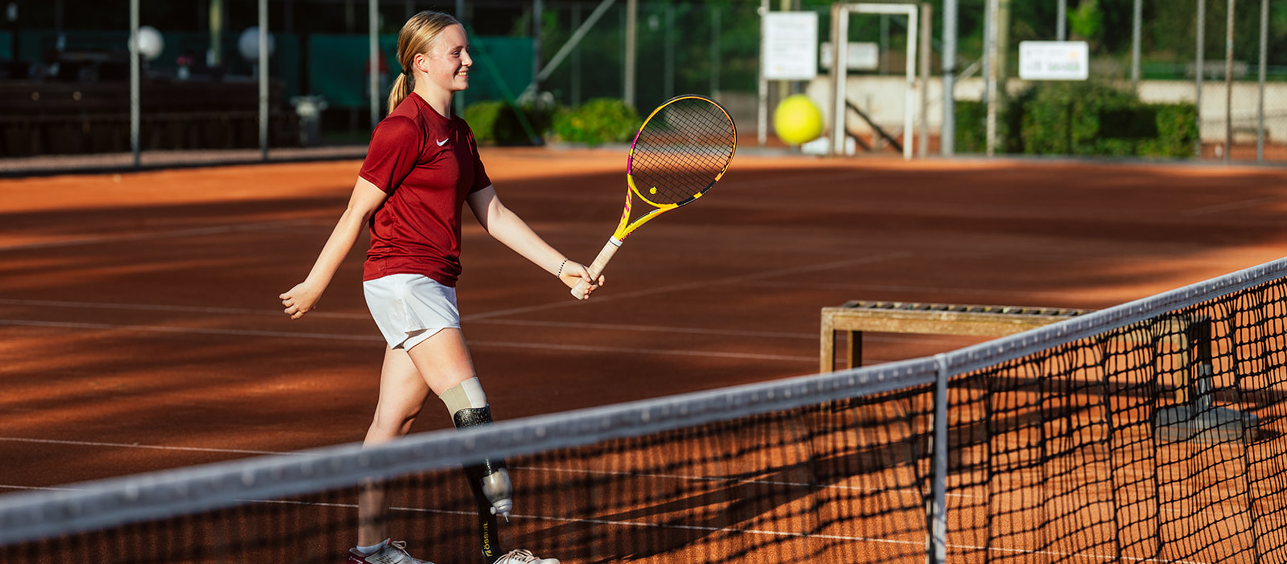 ‘De eerste paar stappen met de nieuwe prothese waren best eng, maar ik had zoveel geloof in de maker dat ik na één sprintje het vertrouwen op de baan terug had. Opeens kon ik ook weer huppelen, springen en losgaan. Dat was geweldig. Het enige dat ik niet kan is glijden met mijn rechterbeen. Dan struikel ik meteen. Maar, kom maar op met die dropshots hoor.’
