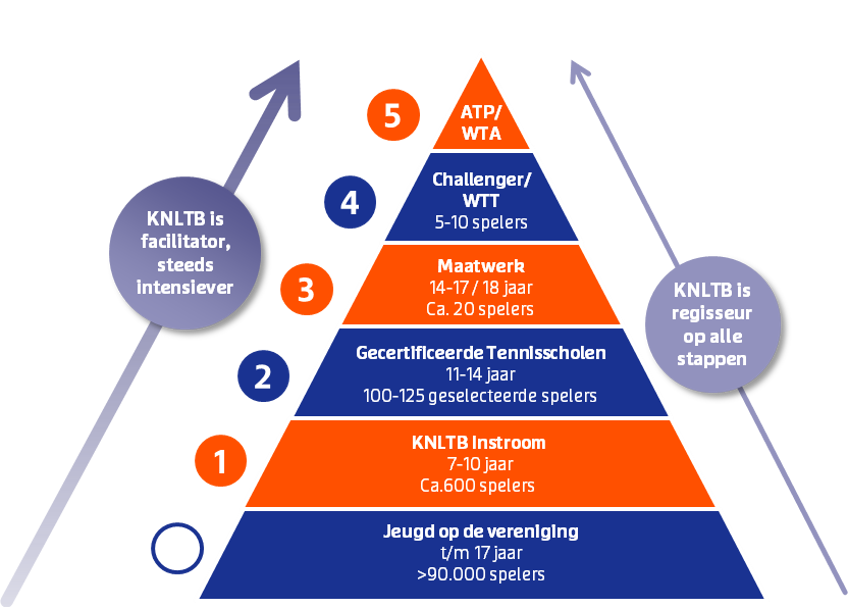 De KNLTB creëert een toptennisklimaat waarin elk talent van jong tot oud met de juiste training en begeleiding de kans krijgt zich optimaal te ontwikkelen. Binnen de KNLTB Jeugdopleiding stroomt een talent van de vereniging in bij het instroomprogramma, vervolgens door naar een (gecertificeerde) tennisschool en van daar in een maatwerktraject van de KNLTB als jeugdspeler of als jonge prof. De afbeelding hieronder geeft een overzicht van de route naar de top voor spelers met potentie weer.