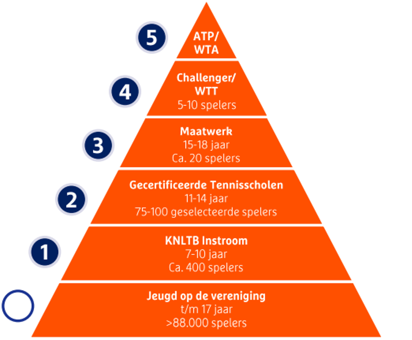 De internationale top bereiken doe je niet zomaar, daar is naast aanleg ook veel trainingsarbeid, doorzettingsvermogen en discipline voor nodig. Van de vele jeugdleden die jaarlijks tennissen, zullen er slechts enkele de top halen. De KNLTB wil dan ook een toptennisklimaat en opleidingsstructuur creëren in Nederland waarin elk talent van jong tot oud met de juiste training en begeleiding de kans krijgt zich optimaal te ontwikkelen, om uiteindelijk een kans te hebben om van tennis zijn/haar beroep te maken.