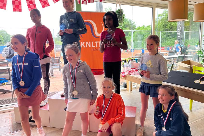 Links de winnaars van de meisjes tot en met 12 jaar, met Kiki Beck op het hoogste schavot.