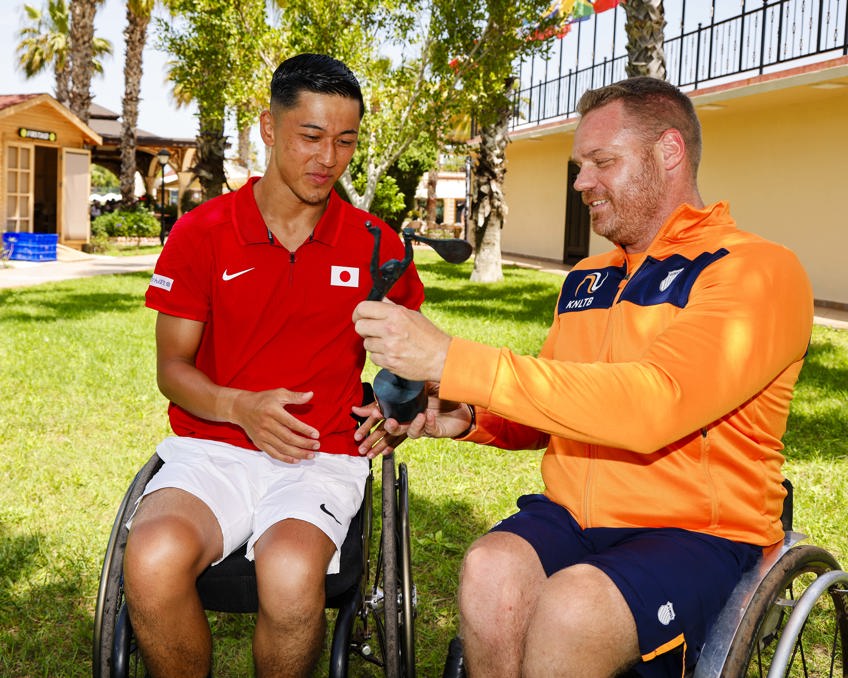 AFBEELDING ONDER: Maikel Scheffers overhandigt de trofee aan de Japanner Tokito Oda. Credits voor alle afbeeldingen: Frank Molter, ITF.
