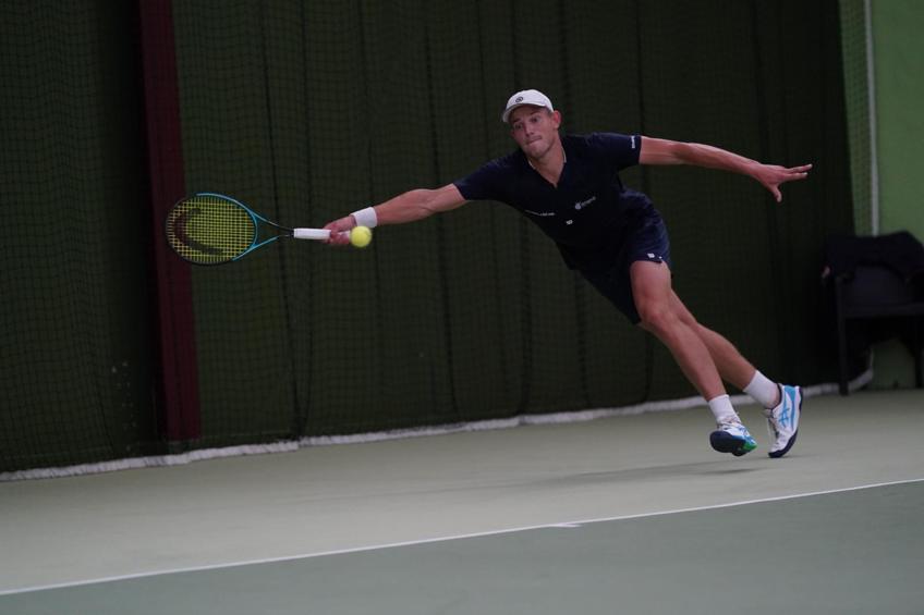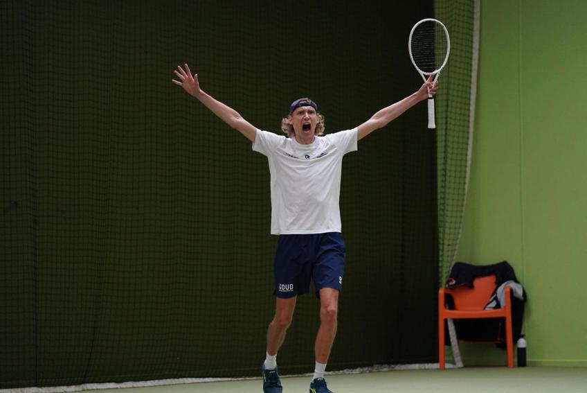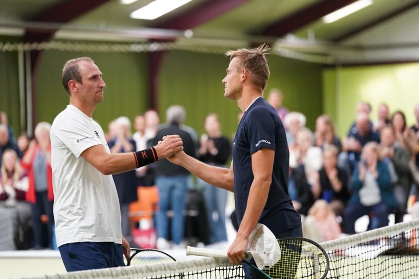Met zijn schitterende enkelhandige backhand won Ronetto van Tilburg in een mooie baselineduel van Jarno Jans en op de indoorbaan ernaast verraste Niels Lootsma de tot dit moment nog ongeslagen Abel Forger met aanvallend tennis, gewaagde tweede opslagen en enorm knappe punten op de belangrijke momenten. Het was een wedstrijd die ook zomaar de ander kant op kon vallen, aangezien Forger in beide tiebreaks setpunten had. Lootsma erkende dat de switch naar indoor gunstig was voor Nieuwerkerk. “Zij zijn waarschijnlijk iets beter op gravel, dus voor ons was het wel een voordeel. Indoor zijn de marges kleiner en vallen de verschillen wat weg”, aldus Lootsma (FOTO onder, juichend na zijn zege).