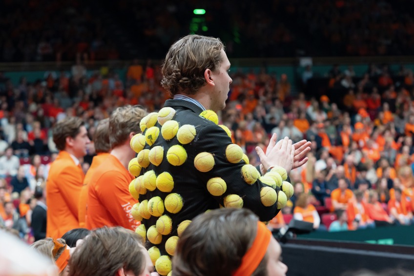 Onder aanvoering van de praeses, gehuld in het bekende jasje met de tennisballen, zingen de studenten op maat gemaakt liedjes per speler. ‘Voor Jesper de Jong en de debuterende dubbelaars moesten we nieuwe leuzen bedenken. Daar zijn we de afgelopen weken dus nog even hard mee aan de slag gegaan. Wat betreft het bekende jasje, die is inmiddels al 15 jaar oud. Door de tennisballen die er op zijn genaaid is het een moeilijk te wassen kledingstuk. Dus hoe die inmiddels ruikt kunnen de mensen zelf wel invullen, haha!’
